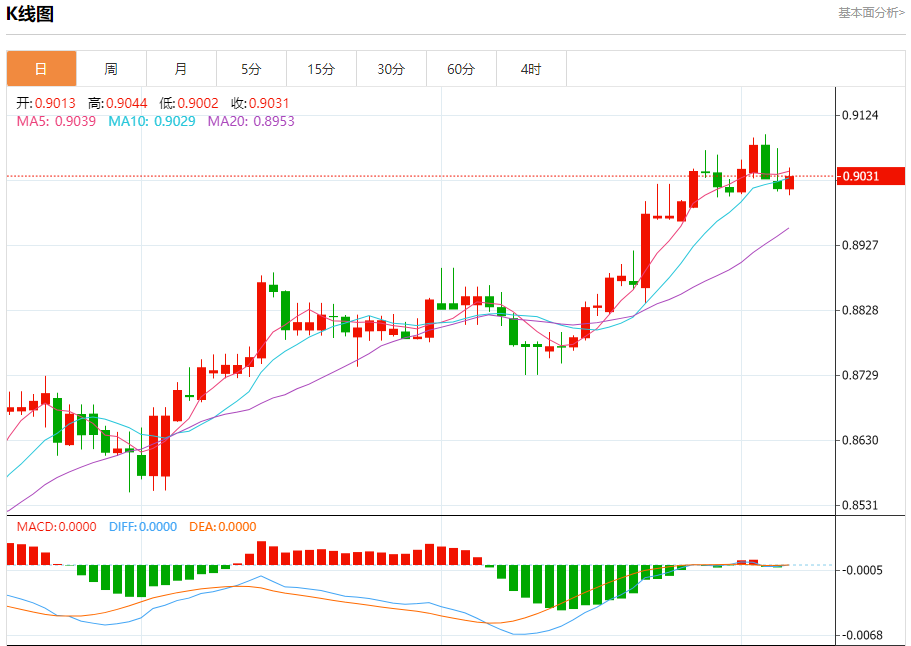 周五纽盘,瑞郎兑美元交投于0.9034,涨幅为0.21%。