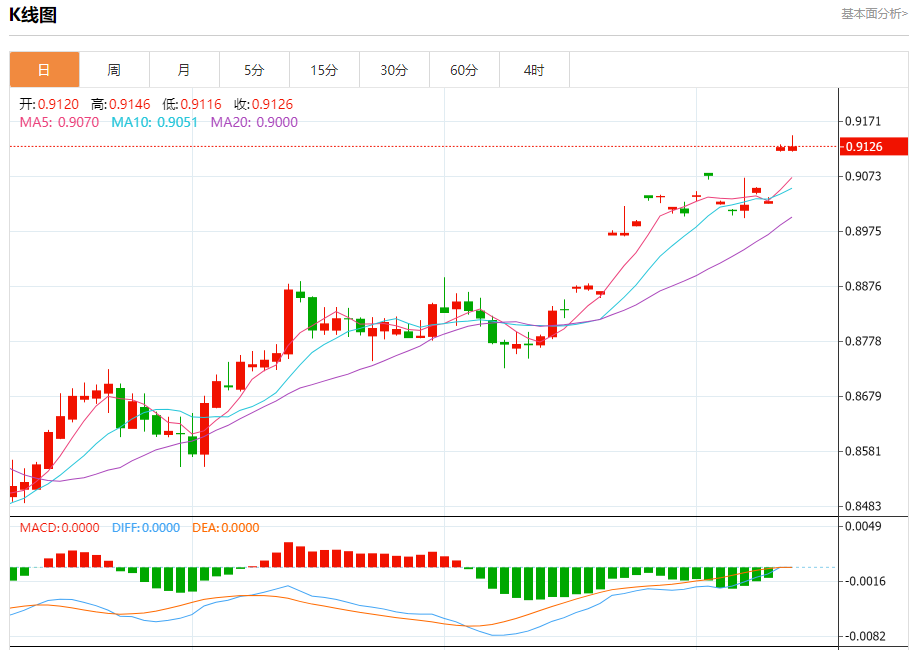 周四纽盘,瑞郎兑美元交投于0.9127,跌幅为0.03%。