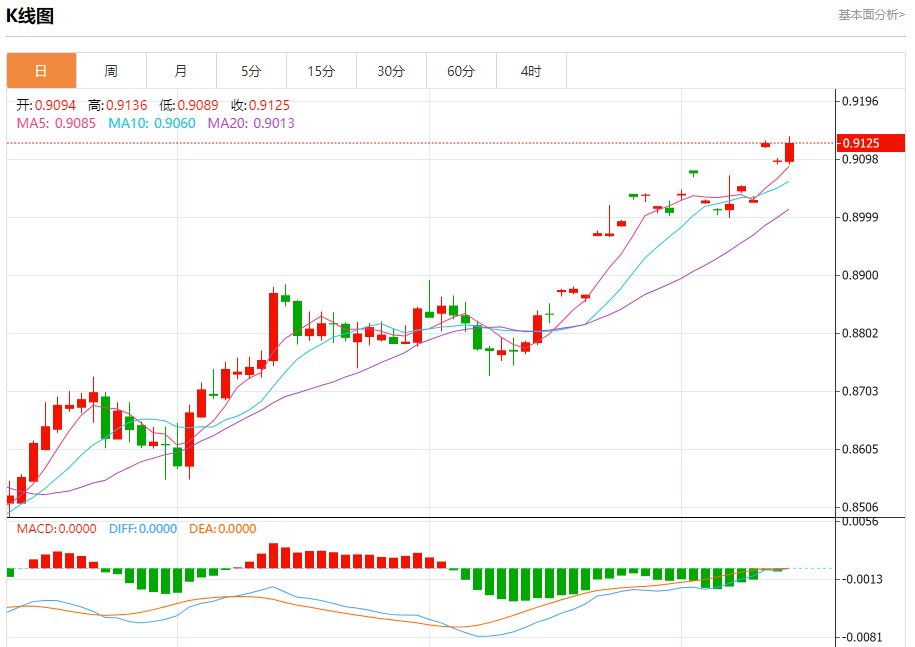 周五纽盘,瑞郎兑美元交投于0.9126,涨幅为0.28%。