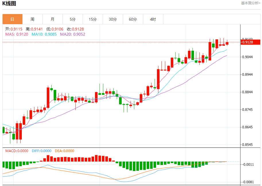 周二纽盘,瑞郎兑美元交投于0.9128,涨幅为0.13%。