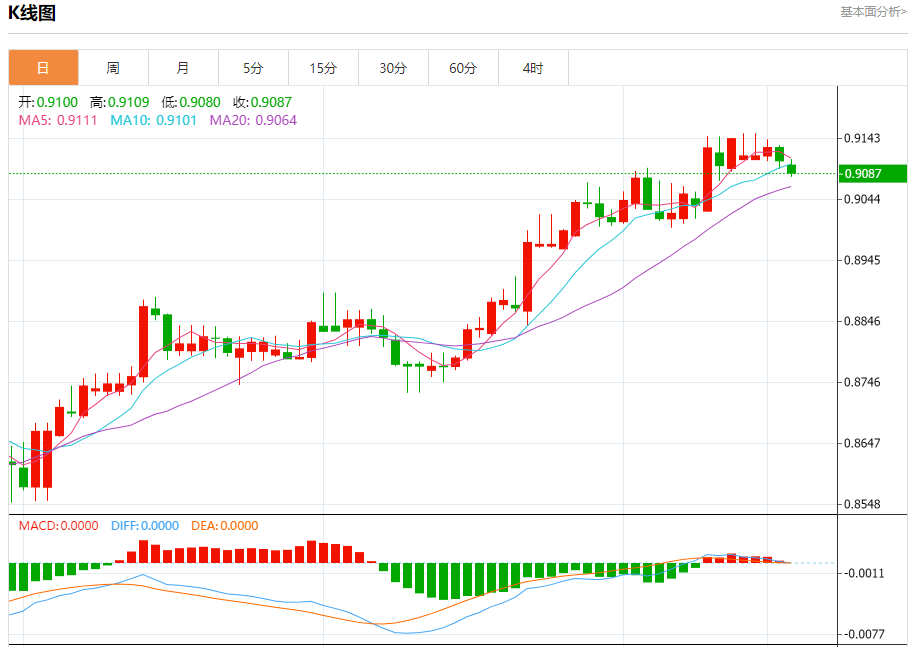 周四纽盘,瑞郎兑美元交投于0.9088,跌幅为0.23%。