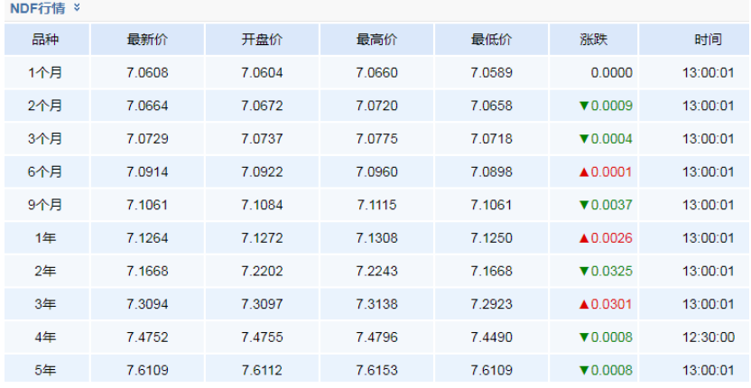 2019年10月30日人民币NDF市场远期外汇合约汇率查询: