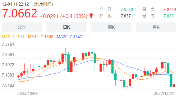 由于中国官方制造业PMI数据好于预期,美元兑离岸人民币有望在7.0600附近结束反弹走势。11月财新制造业PMI为49.4,预期为48.9,10月为49.2。中国官方制造业采购经理人指数(PMI)意外上升,预计将在未来支撑人民币。