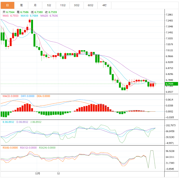 截至发稿时,美元兑离岸人民币未能突破两个月来的下行阻力线6.7580左右,导致美元兑离岸人民币走向6.7250附近的两周支撑线。