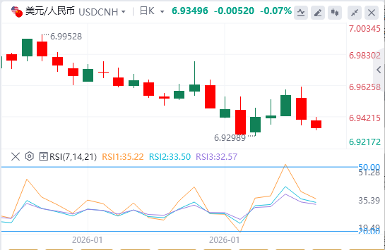 2月3日,周二欧市初盘,美元兑人民币汇率下跌至6.9350。随着中国人民币(CNH)因季节性强劲需求持续优于美元,该货币对向33个月低点6.9310下行。