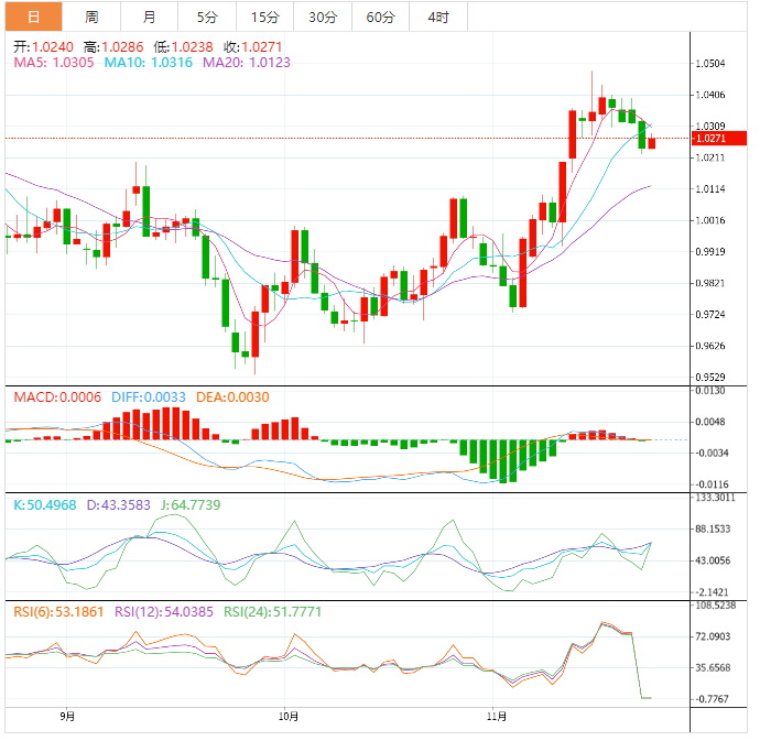 斐波那契回回工具显示,61.8%水平与趋势线和200 SMA动态拐点一致。小幅回调可能已经在1.0200附近的38.2% Fib或与100移动平均线重合的50%水平找到了买家。