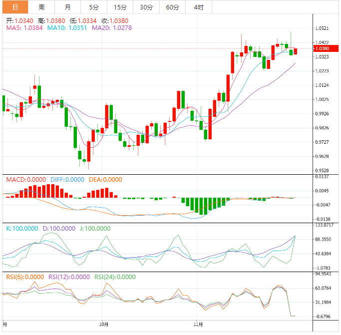 主要货币对已经跌破20期指数移动平均线(EMA) 1.0360,而50期移动平均线1.0277仍在前进。