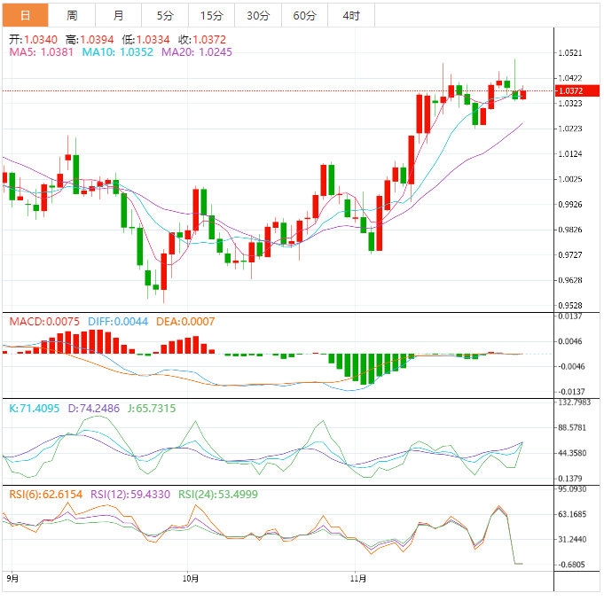 周二盘中,欧元兑美元上涨至1.0372,涨幅0.30%。