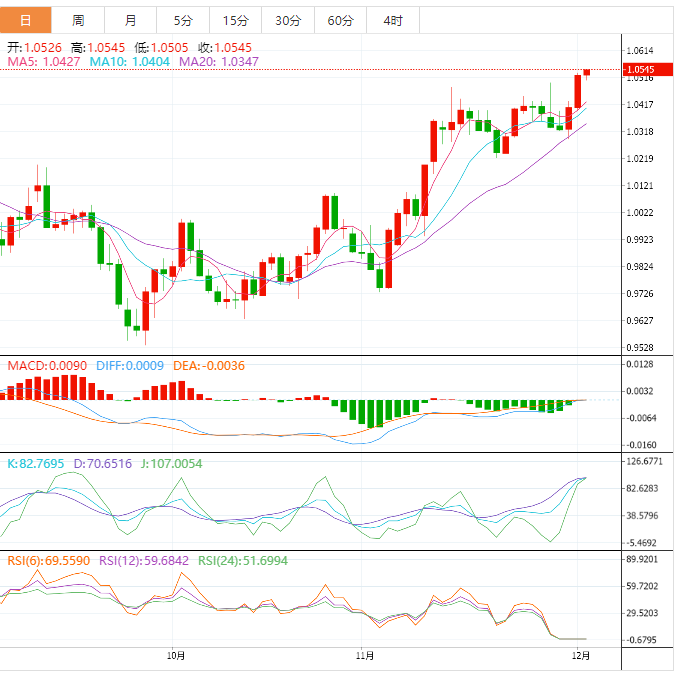周五盘中,欧元兑美元上涨至1.0545,涨幅0.17%。