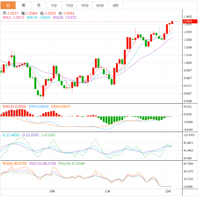 周一盘中,欧元兑美元上涨至1.0564,涨幅0.21%。