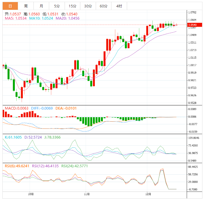 周二盘中,欧元兑美元上涨至1.0542,涨幅0.04%。