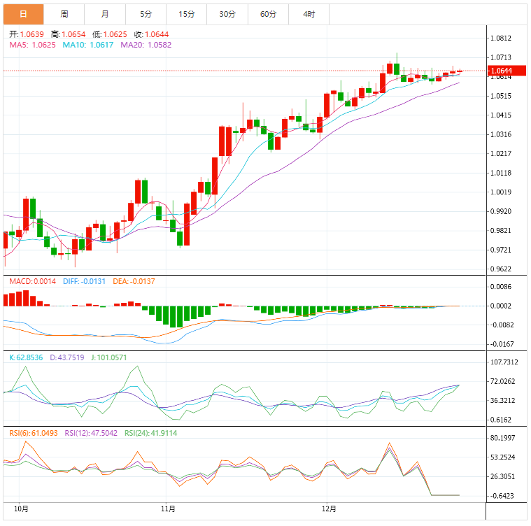 周三盘中,欧元兑美元上涨至1.0644,涨幅0.04%。