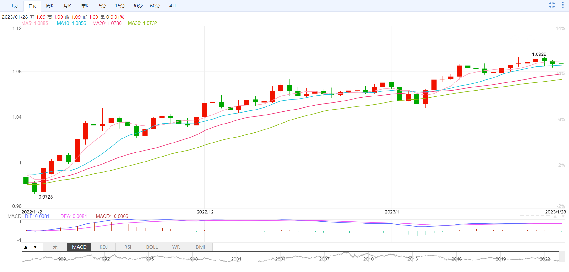 欧洲央行官员的鹰派言论让欧元兑美元获得动力,并触及1.0930附近的九个月最高水平。欧洲央行政策制定者克拉斯·诺特(Klaas Knot)和彼得·卡兹米尔(Peter Kazimir)都表示,他们赞成在2月和3月再加息两次50个基点。与此同时,欧洲央行行长拉加德周一在德国的一次会议上重申:“我们已经明确表示,欧洲央行利率仍必须以稳定的速度大幅上升,才能达到足够严格的水平,并在必要的时间内保持在这一水平。”