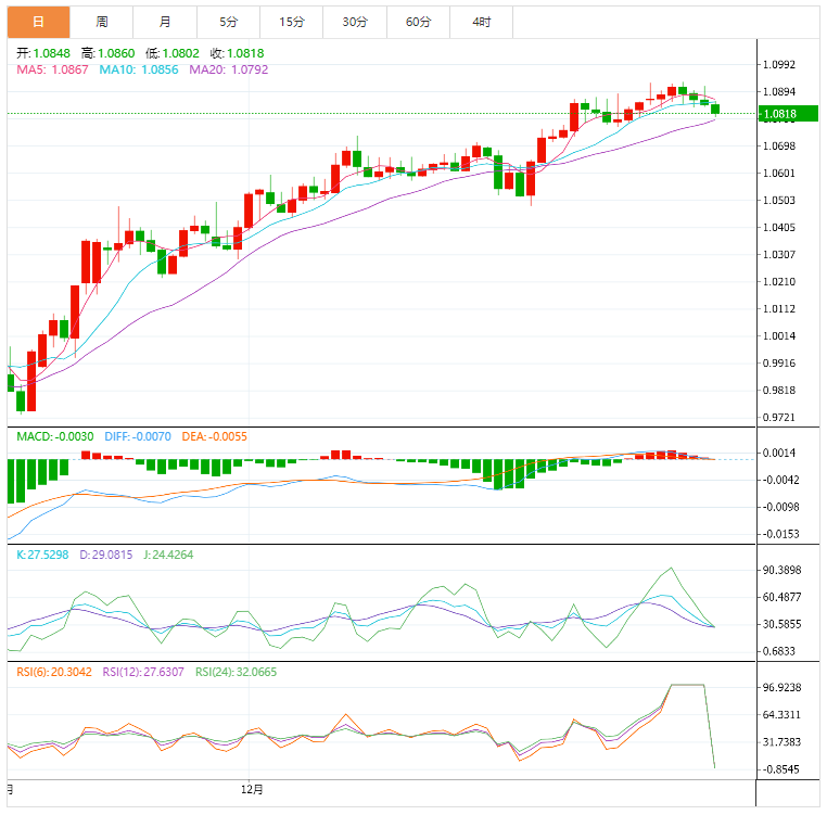 欧元兑美元连续第四个交易日下跌,自上周周二接近1.0930的新顶部以来下跌了1美分,