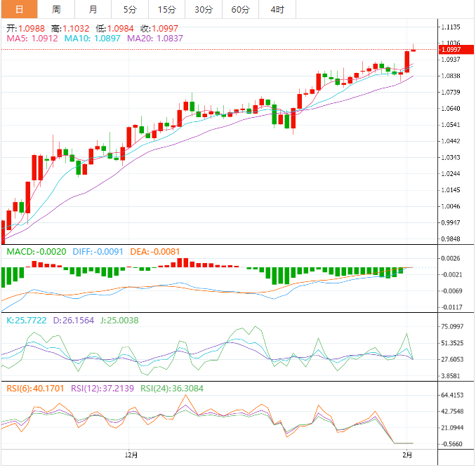 周四盘中,欧元兑美元上涨至1.0998,涨幅0.09%。