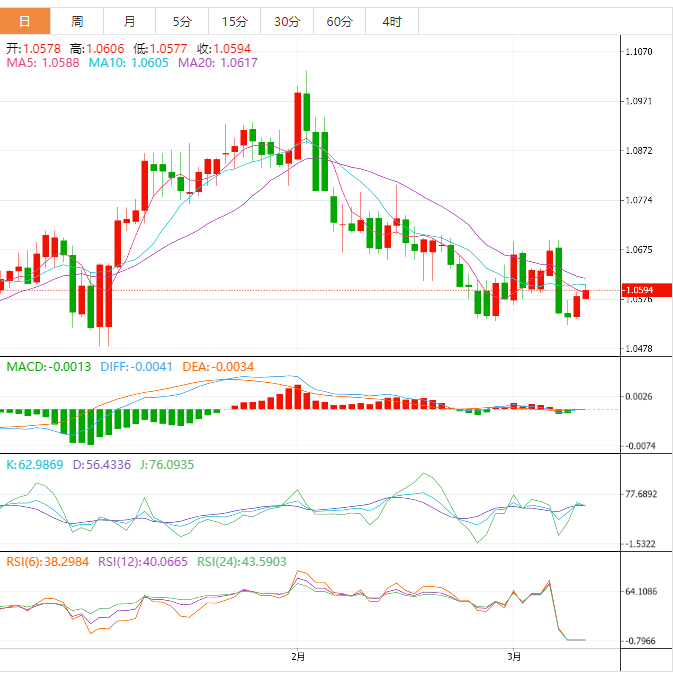 周五盘中,欧元兑美元上涨至1.0595,涨幅0.11%。