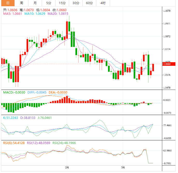 周五盘中,欧元兑美元上涨至1.0662,涨幅0.50%。