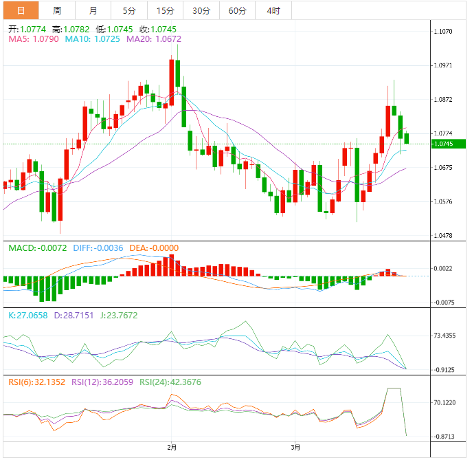 周一盘中,欧元兑美元下跌至1.0746,跌幅0.13%。