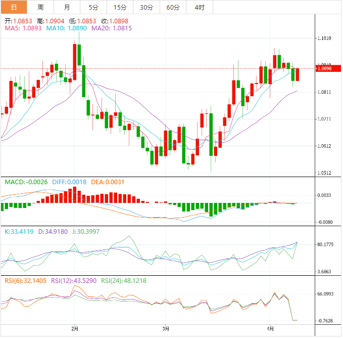 周二盘中,欧元兑美元上涨至1.0899,涨幅0.40%。