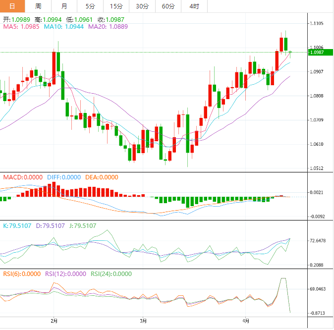 周一盘中,欧元兑美元下跌至1.0988,跌幅0.02%。