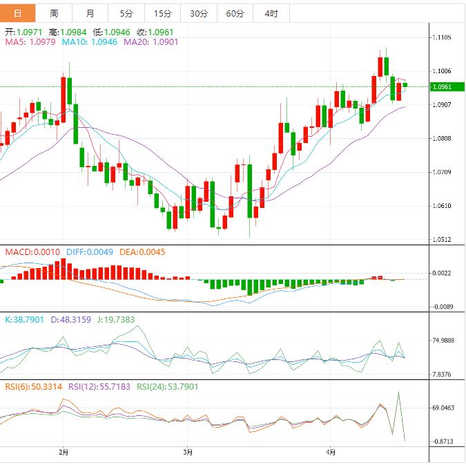 周三盘中,欧元兑美元下跌至1.0962,跌幅0.08%。