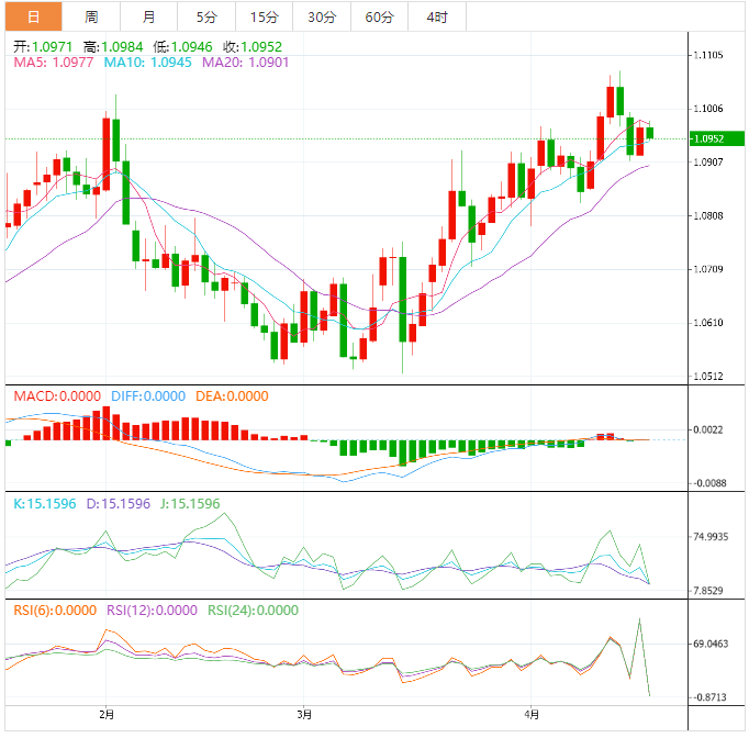 到目前为止,欧元兑美元已下跌0.05%至1.0966,并面临下一个支撑位1.0831(4月10日的月低点),其次是1.0788(4月3日的月低点),最后是1.0756(55日移动均线)。