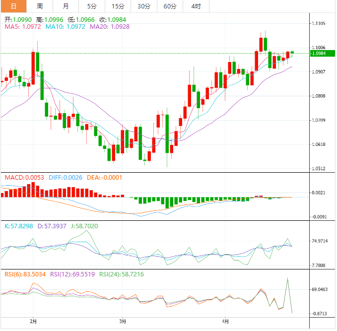 周一盘中,欧元兑美元下跌至1.0984,跌幅0.07%。
