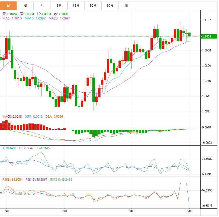 周一盘中,欧元兑美元下跌至1.1004,跌幅0.19%。