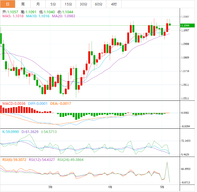5月4日周四盘中,欧元/美元现在削弱了近期的部分乐观基调,并回撤至1.1050附近,此前曾试图测试1.1100这一整数关口,但未果。