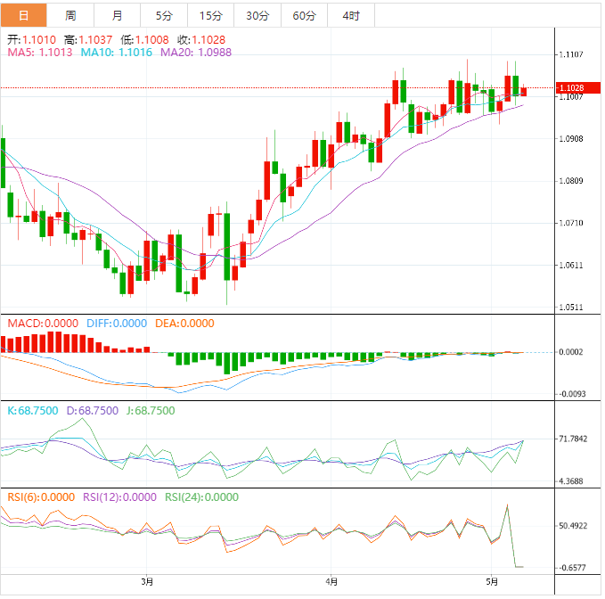 值得注意的是,从4月中旬开始的一个向上倾斜的阻力线,接近1.1095,随后很快到达1.1100,可能会限制欧元对在1.1035之上的短期进一步上行。