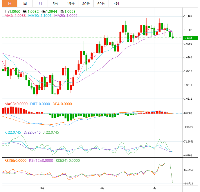 到目前为止,欧元兑美元已经下跌0.03%至1.0957,并面临下一个竞争水平1.0941(5月2日的月最低价),随后是1.0909(4月17日的周最低价),最后是1.0831(4月10日的月最低价)。