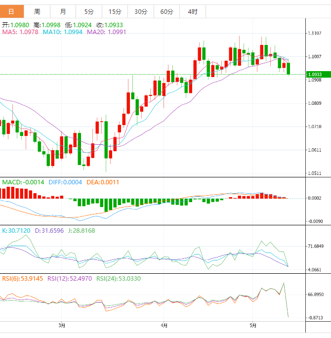 周四盘中,欧元兑美元下跌至1.0932,跌幅0.42%。