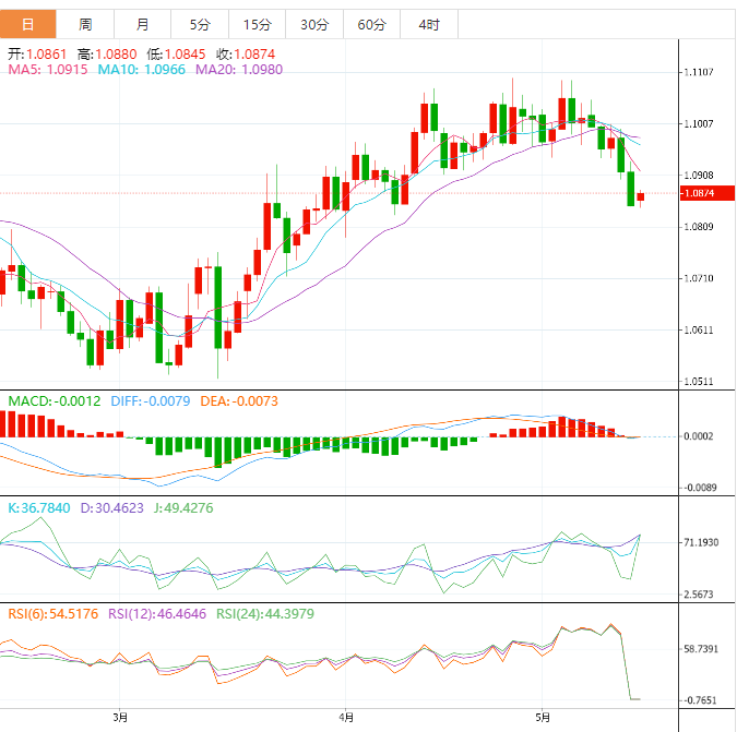 周一盘中,欧元兑美元上涨至1.0877,涨幅0.25%。