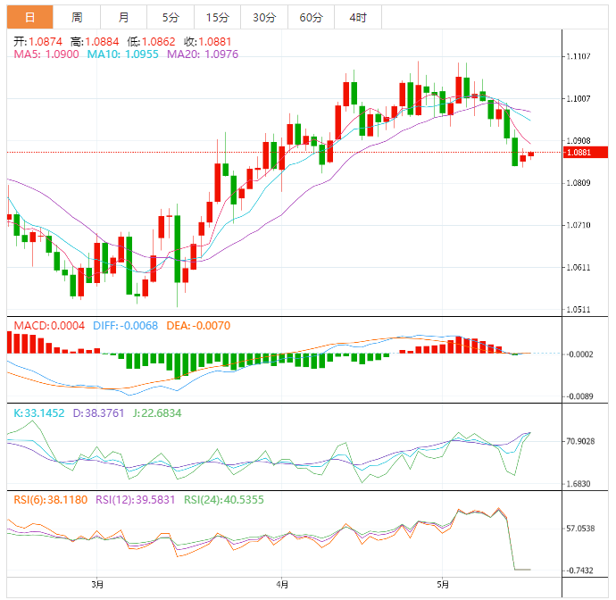 周二盘中,欧元兑美元上涨至1.0882,涨幅0.06%。