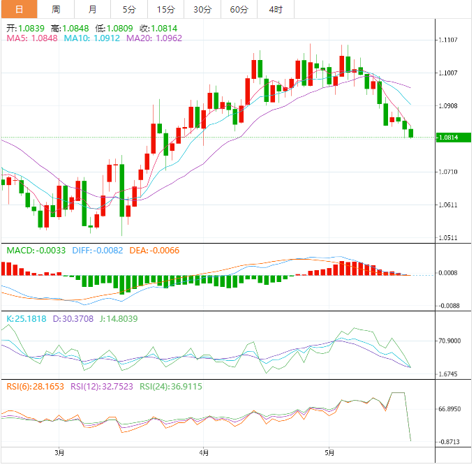 周四盘中,欧元兑美元下跌至1.0815,跌幅0.22%。