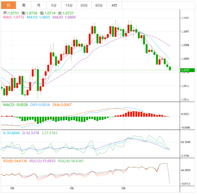 到目前为止,欧元兑美元已经下跌了0.23%,到达1.0724,并且马上面临着1.0714(5月19日的月最低价)的争夺,其次是1.0712(3月24日的最低价),最后是1.0516(3月15日的最低价)。