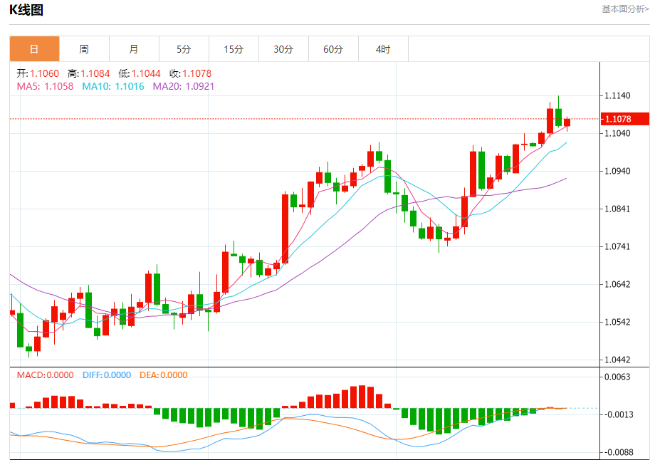 今日周五,截止目前欧元兑美元报1.1080,上涨0.16%。