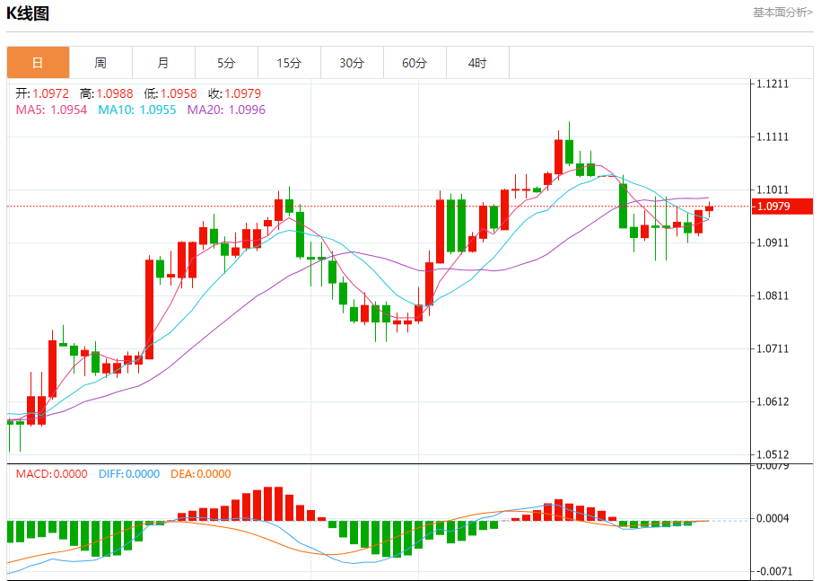 今日周四,截止目前欧元兑美元报1.0980,上涨0.06%。