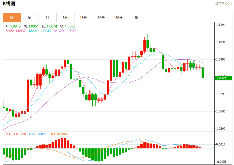 今日周二,截止目前欧元兑美元报1.0890,下跌0.54%。