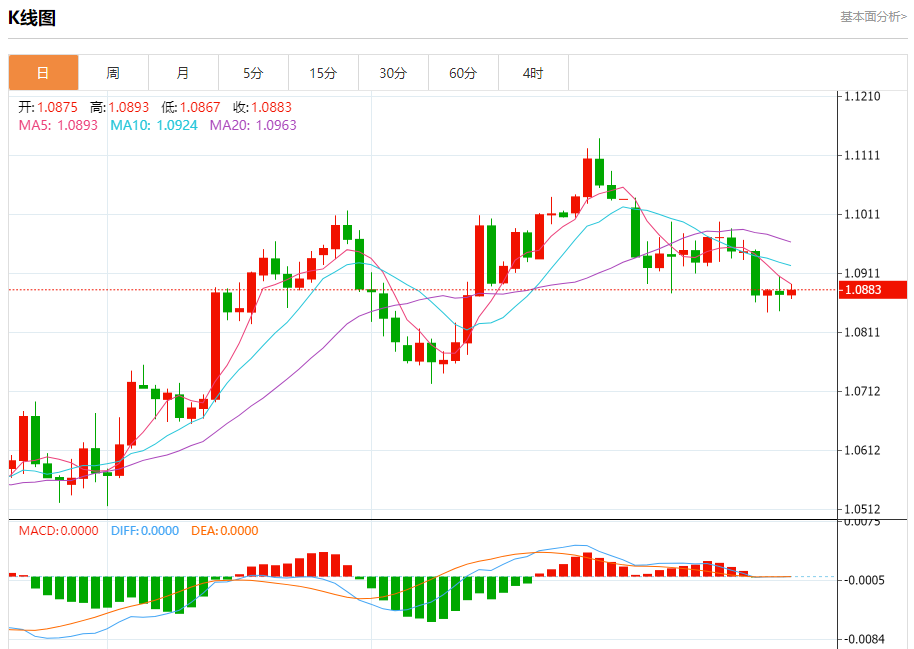 周五欧市盘中,欧元兑美元交投于1.0883,涨幅为0.06%。