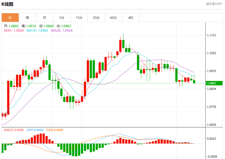 今日周二,截止目前欧元兑美元报1.0868,下跌0.14%。