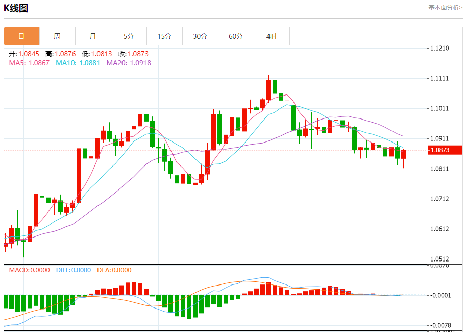 今日周五,截止目前欧元兑美元报1.0874,上涨0.25%。