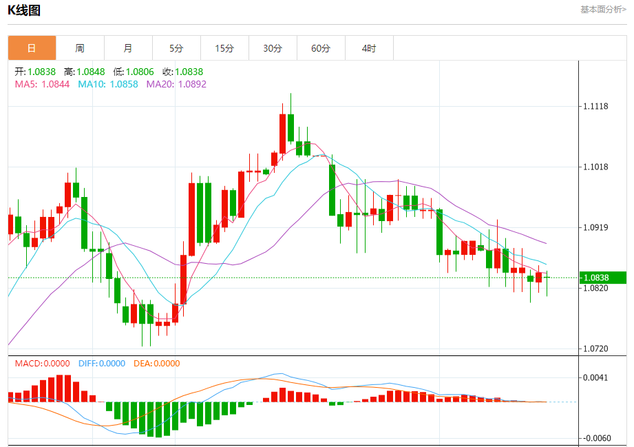 周三欧市盘中,欧元兑美元交投于1.0838,跌幅为0.07%。