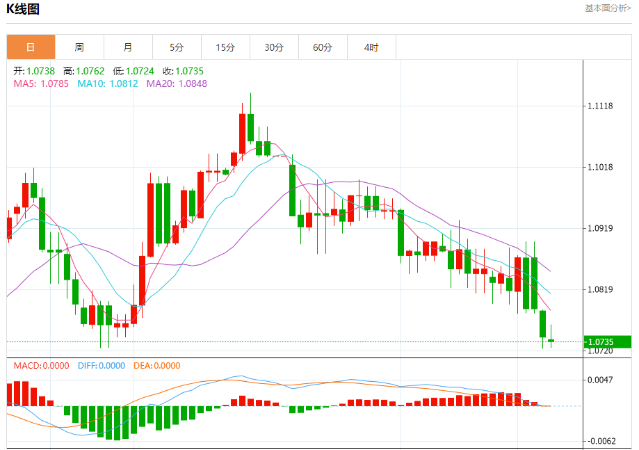今日周二,截止目前欧元兑美元报1.0735,下跌0.07%。