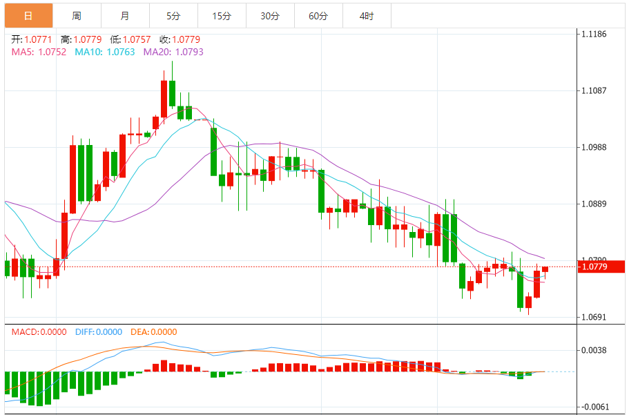 今日周五,截止目前欧元兑美元报1.0780,上涨0.06%。