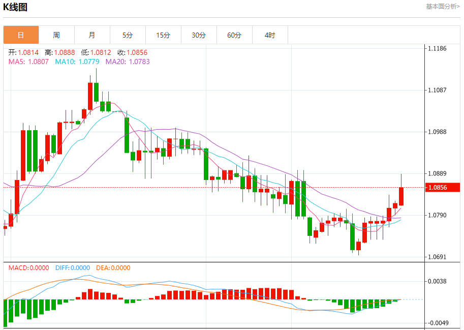 今日周四,截止目前欧元兑美元报1.0856,上涨0.34%。