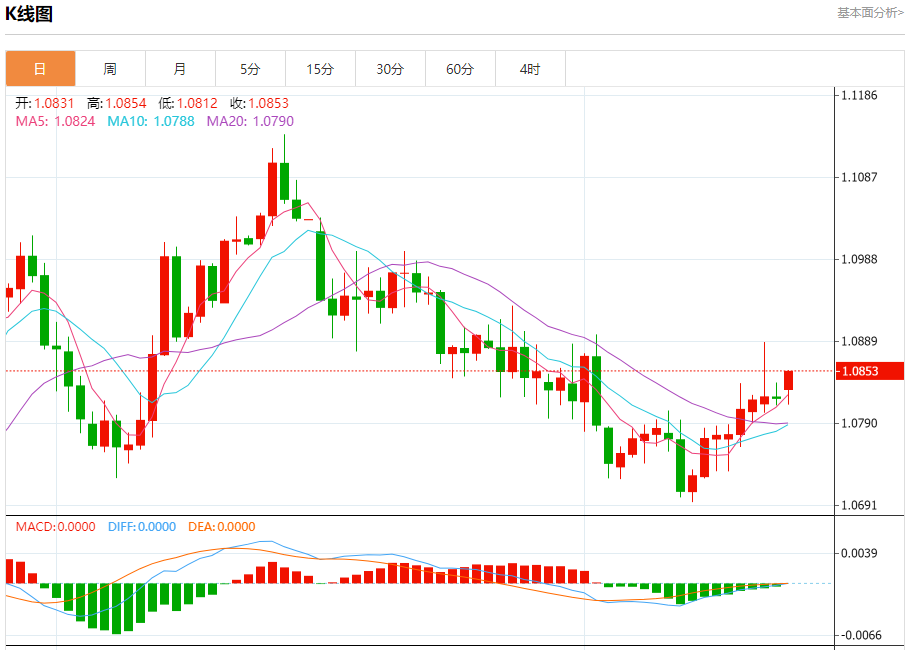 今日周一,截止目前欧元兑美元报1.0855,上涨0.31%。