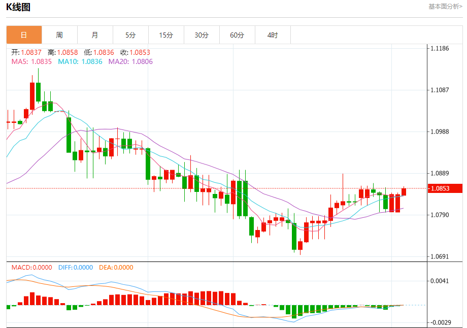 今日周一,截止目前欧元兑美元报1.0854,上涨0.13%。