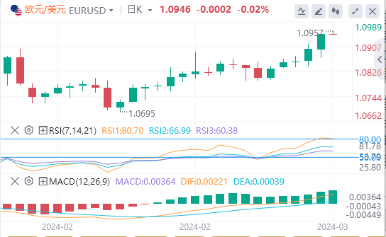 3月8日,周五欧市盘前,欧元/美元在回撤盘中涨幅后盘整,难以延续自3月1日开始的连胜势头。市场参与者热切期待两个经济体的关键事件,包括欧元区国内生产总值(GDP)数据和美国非农就业数据。在这种预期下,欧元/美元徘徊在1.0950附近。