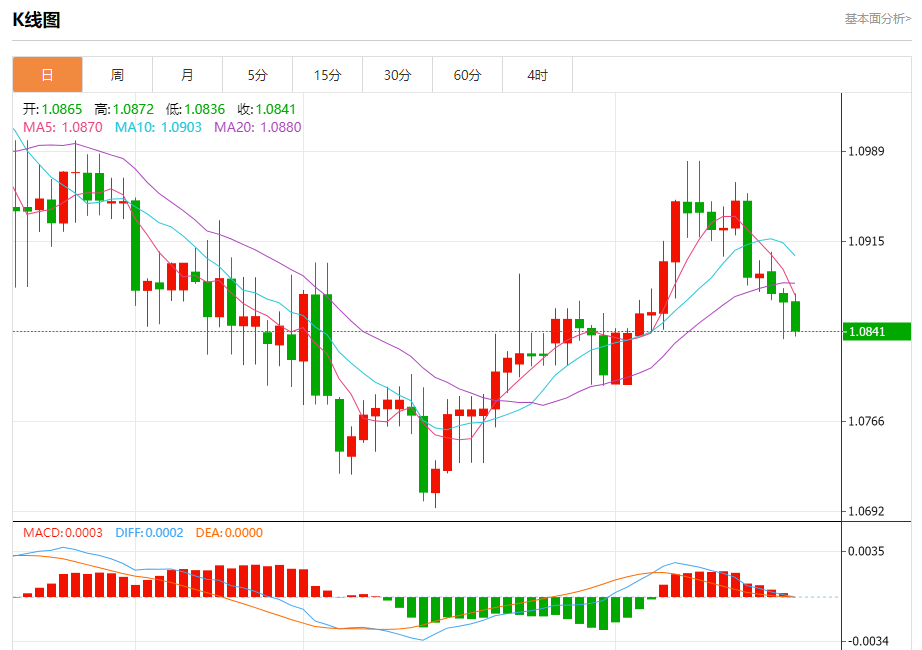 今日周三,截止目前欧元兑美元报1.0843,下跌0.21%。